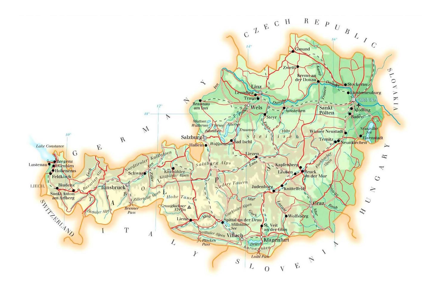 Mapa Austrii wysokości. Austria wysokości karty (Europa Zachodnia - Europa) do druku. Austria wysokości karty (Europa Zachodnia - Europa) do pobrania.